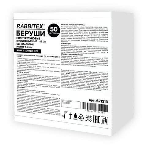 Беруши одноразовые пенополиуретановые без шнурка, 1 пара в пакете, SNR 43 дБ, RABBITEX (РАББИТЕКС), 671312