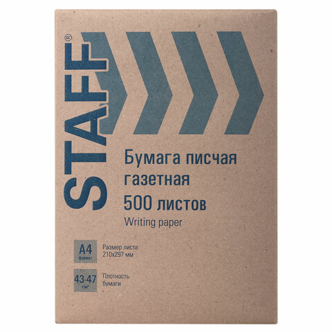 Газетная бумага STAFF формата А4 представлена в пачках, упакованных в плотную крафтовую бумагу, по 500 листов. Плотность - 43-47 г/м2, белизна 61% (ISO). Бумага подходит для изготовления объявлений, листовок, газет, рекламных брошюр, для плетения из бумажной лозы. Также данный вид бумаги может быть использован как упаковочный материал для хрупких вещей, книг, обуви, одежды.
