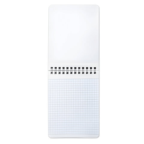 Блокнот формата А6 на евроспирали содержит 40 листов с линовкой в клетку. Гребень расположен сверху. Обложка выполнена из мелованного картона плотностью 190 г/м2. Внутренний блок состоит из белой офсетной бумаги плотностью 60 г/м2.