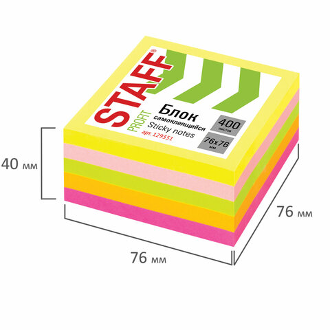 Блок самоклеящийся (стикеры) STAFF НЕОНОВЫЙ, 76х76 мм, 400 листов, 5 цветов, 129351