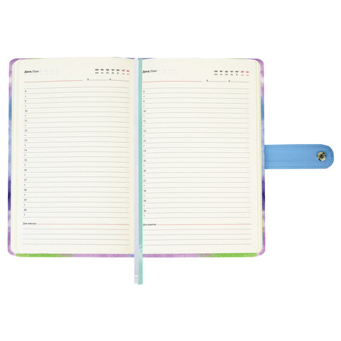Твердая обложка с эффектом каменной крошки подходит для горячего тиснения. Также обложка фиксируется застежкой, поэтому ежедневник не откроется в сумке или портфеле и страницы не помнутся. Яркие цвета придают изделию особый шарм. Дополнением служат 2 закладки-ляссе, с помощью которых можно быстро открыть ежедневник на нужной странице. Кроме того, ежедневник снабжен обширным справочным материалом. В конце имеются 7 страниц для записей и заметок.
