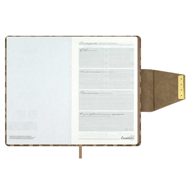 Ежедневник недатированный ESCALADA, А5, 160 л., арт. 70667/ 15 ВИНЧЕНЦО БЕЖЕВЫЙ (кожзам: 125x211 мм, твёрдый переплёт, материал обложки: искусственная кожа "Винченцо"; способ крепления блока: ниткошвейный; декор: блинтовое тиснение, металлический шильд по краю обложки; вн. блок: 160 л., кремовый офсет 70 г/м², печать в одну краску (линия), справочный материал: есть; перфорация углов блока: нет; отделка среза: окрашивание пантоном; закладка/-и: одно ляссе, каптал: есть; форзац: печать пантоном, тиснение фольгой, особенности: магнитный клапан; персонализация возможна: нет; индивидуальная упаковка: ПЭТ-пакет)