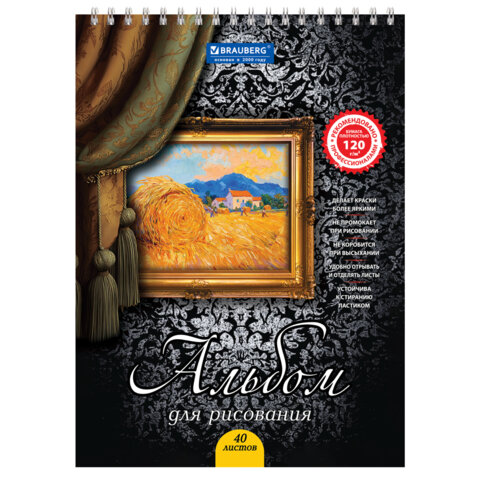 Купить Альбом для рисования, А4, 40 листов, гребень, выборочный лак, подложка, 120 г/м2, BRAUBERG, 205х290 мм, "Картина" (2 вида), 102834 вы можете в компании Канцтовары Карандашов, оформив заказ в интернет магазине, или