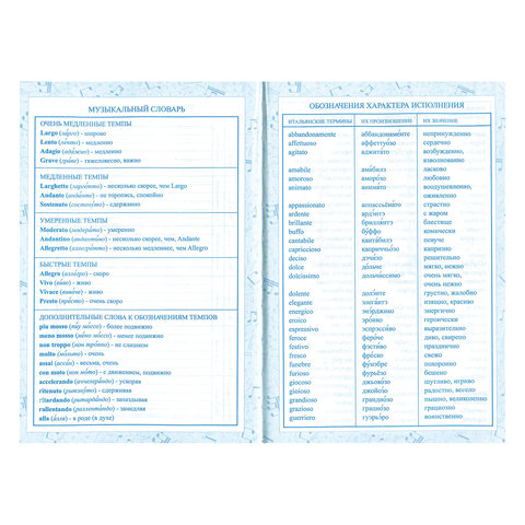 Внутренний блок изготовлен из белой офсетной бумаги плотностью 60 г/м2. Содержит 48 листов для ведения записей и справочную информацию: длительности нот, интервалы, знаки в тональностях, ключи и пр. Твердая обложка надежно защищает бумагу и долго сохраняет привлекательный внешний вид. Благодаря ламинации краски на изображении становятся более яркими и насыщенными, исключается возможное истирание рисунка. Выборочное лакирование эффектно подчеркивает отдельные элементы дизайна.