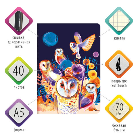 Тетрадь 40 л. в клетку обложка SoftTouch, бежевая бумага 70 г/м2, сшивка, А5 (147х210 мм), СОВЫ, BRAUBERG, 403780
