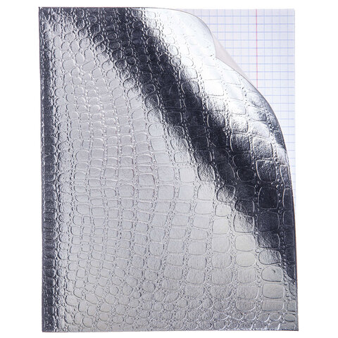 Тетрадь А5 формата, 48 листов. Обложка – бумвинил, "Metallic", серебряный, дополненный спецэффектами в виде тиснения CROCO. Внутренний блок – офсет 60-65 г/м2, клетка, красные поля. Тип скрепления – скоба.