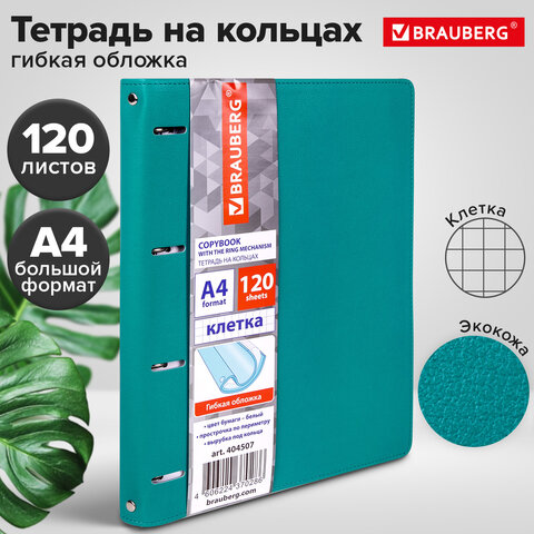 Тетрадь на кольцах БОЛЬШАЯ А4 (240х310 мм), 120 листов, под кожу, клетка, BRAUBERG "Joy", бирюзовый/серо-голубой, 404507
