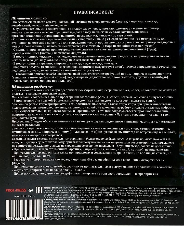 Магическое мерцание фольги и блеск твин-лака на отдельных элементах обложки особенно эффектно выглядит на черном фоне. Внутри расположен справочный материал с подсказками по соответствующему школьному предмету. Обложка: мелованный целлюлозный картон, печать по холодной фольге, твин-лак. Внутренний блок: офсет 60 г/м 100 % белизны, 48 листов. Линовка: линия.