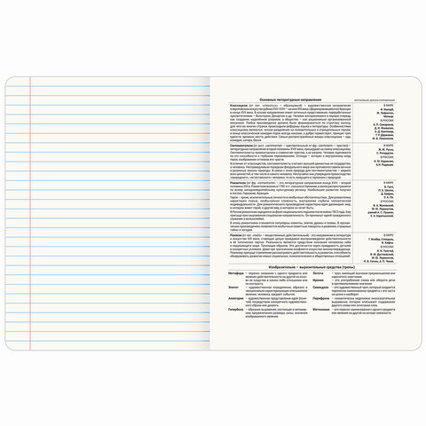 Тетрадь формата А5 (165х205 мм) содержит 48 листов, изготовленных из высококачественной офсетной бумаги плотностью 60 г/м2 и белизной 100%. Листы соединены скобами. Линовка блока – в линию, красные поля.