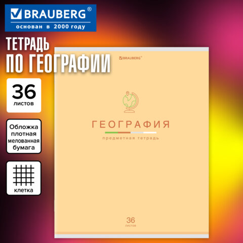 Тетрадь предметная "МИР ЗНАНИЙ" 36 л., обложка мелованная бумага, ГЕОГРАФИЯ, клетка, BRAUBERG, 404597