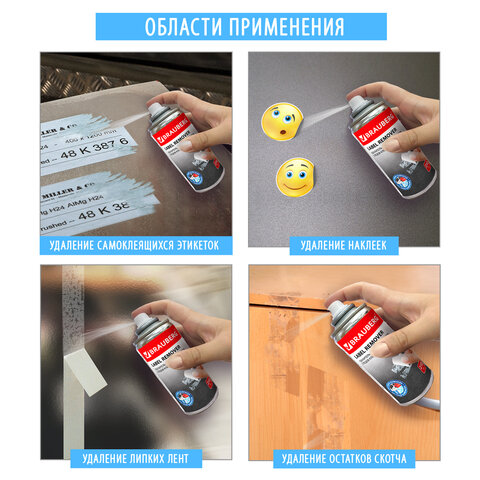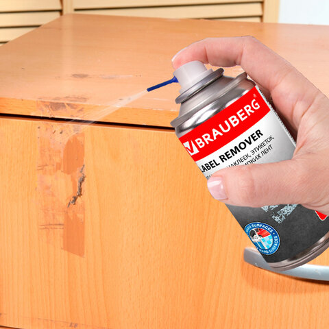 Средство обеспечивает быстрое и безопасное удаление остатков клея, различных клейких лент, самоклеящихся этикеток, наклеек и жевательной резинки с твердых поверхностей в домашних условиях, офисе, на производстве. Объем баллона составляет 210 мл. Гелеобразный тиксотропный состав после распыления не стекает с поверхности и эффективно растворяет остатки клея без повреждений и царапин на поверхности. Состав огнеопасен! Баллон необходимо предохранять от воздействия прямых солнечных лучей и нагревания свыше 50°С. Запрещается распылять вблизи источников открытого огня и раскаленных предметов! Использовать строго при выключенном оборудовании! Инструкция по применению: • Перед использованием энергично встряхните баллон. • Во избежание попадания следов аэрозоля защитите поверхности, не подвергающиеся обработке. • Удалите следы основы от клейких лент, наклеек и этикеток пластиковым скребком или вручную. • Равномерно распылите состав на остатки клеевого слоя, дайте подействовать 30-40 секунд. • Не допускайте длительный контакт состава с пластиковыми деталями. • Удалите средство с помощью пластикового скребка, сухой тряпки или салфетки. • Если этикетка имеет влагоотталкивающий слой - предварительно удалите его так, чтобы средство могло проникнуть к клеевой основе. Следует соблюдать повышенную аккуратность при работе с окрашенными и ламинированными поверхностями! ПЕРЕД ПРИМЕНЕНИЕМ НА ПЛАСТИКОВЫХ И ОКРАШЕННЫХ ПОВЕРХНОСТЯХ РЕКОМЕНДУЕТСЯ ПРОТЕСТИРОВАТЬ НА МАЛОЗАМЕТНОМ УЧАСТКЕ (ВОЗМОЖНО ПОВРЕЖДЕНИЕ ПОВЕРХНОСТЕЙ)!