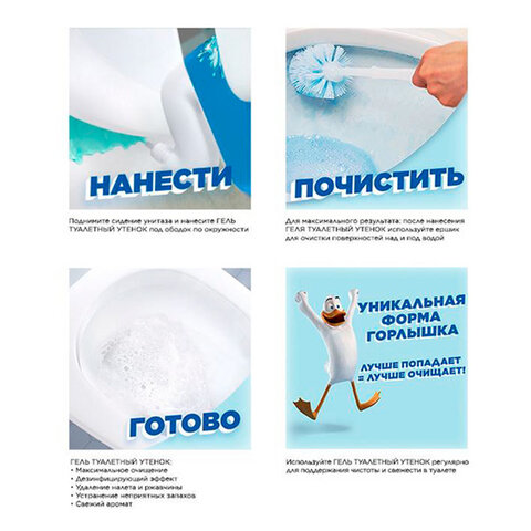Обладает дезинфицирующим эффектом: убивает 99,99% вирусов и бактерий. Устраняет неприятные запахи. Гель экономично расходуется, равномерно распределяется по поверхности и действует даже под водой. Чистящее средство необходимо применять только для очищения унитаза.