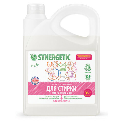 Биоразлагаемый концентрированный гель для стирки SYNERGETIC универсальный обеспечивает бережное и эффективное очищение тканей, гигиеническую чистоту одежды и устраняет неприятные запахи. Комбинация энзимов и растительных ПАВ эффективно удаляет загрязнения и свежие пятна с волокон ткани даже в холодной воде. Функциональные добавки предотвращают окрашивание, а также повторное оседание загрязнений на ткани, сохраняя ее первоначальный вид, насыщенность цвета, прочность и структуру. Гипоаллергенная отдушка на основе эфирных масел оставляет легкий и приятный аромат. Гель предназначен для стирки всех видов тканей, кроме деликатных и мембранных, а также шерсти и шелка. Средство можно использовать в стиральных машинах любого типа и при ручной стирке при температуре 15-90 °C. Биоразлагаемый гель полностью выполаскивается из тканей, подходит для стирки детского белья 0+ и одежды людей с чувствительной кожей.
