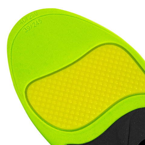 Стельки выполнены из инновационного полиуретана, который имеет структуру микропор, заполненных воздухом, что обеспечивает поглощение ударных нагрузок, водонепроницаемость и износостойкость. Каркасная поддержка свода стопы выполнена из качественной термопластичной резины, с помощью которой происходит равномерное распределение нагрузки на стопу.