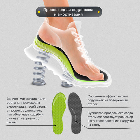 Основа стелек выполнена из инновационного полиуретанового материала, который имеет структуру микропор, заполненных воздухом, что обеспечивает поглощение ударных нагрузок, водонепроницаемость и износостойкость, снижает нагрузку на опорно-двигательный аппарат. Влаговпитывающее покрытие и перфорация, обеспечивающая циркуляцию воздуха, сохраняют оптимальный микроклимат в обуви. Верхняя поверхность стельки имеет сотообразную фактуру, выполненную из специального антискользящего материала. За счёт супинатора продольного свода стопы создается массажный эффект, снимающий усталость с ног при ходьбе.