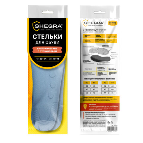 Купить Стельки для обуви АНАТОМИЧЕСКИЕ С СУПИНАТОРОМ, материал PU PRO, размер RU 39-44 / EU 40-45, с линиями выреза, SHEGRA (ШЕГРА), 700739 вы можете в компании Канцтовары Карандашов, оформив заказ в интернет магазине, или