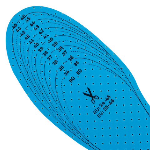 Стельки для обуви с российским размером RU 34-45, что соответствует европейскому размеру EU 35-46. На стельках указаны оба стандарта размера: RU и EU, а также нанесены линии выреза. Для удобства на упаковке приведена таблица соответствия размеров RU/EU.