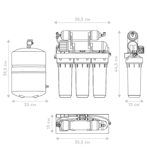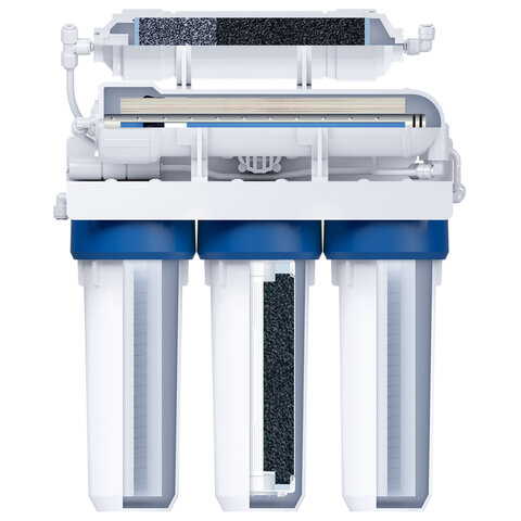 Пятиступенчатый фильтр обратного осмоса в корпусе классического исполнения с картриджами стандарта Slim Line 10, без крана в комплекте. Подойдет для тех, кто создает индивидуальный дизайн кухни и выбирает смеситель самостоятельно. Вода проходит 5 этапов очистки, включая обратноосмотическую мембрану. Тонкопленочный полиамидный композит, из которого изготовлена мембрана, очищает воду на молекулярном уровне до 100%, задерживая всевозможные примеси, включая бактерии и вирусы. Вода после фильтра обратного осмоса не уступает по качеству бутилированной. Показатели после фильтрации: общая минерализация – до 50 ppm, pH в диапазоне 6-9. Показатель минерализации может варьироваться в зависимости от условий эксплуатации и водопотребления.
