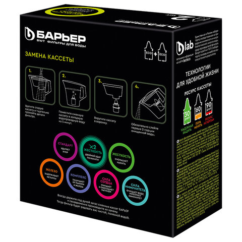 Сменная кассета для фильтра БАРЬЕР Жесткость Железо работает комплексно: снижает жесткость, которую мы привыкли встречать в жизни в виде накипи, удаляет из воды растворенное железо и неприятный металлический привкус, а также, как и все кассеты БАРЬЕР, очищает от хлора, тяжелых металлов и других вредных примесей. Результат – чистая вода без накипи, рыжеватого осадка и неприятного привкуса. Ресурс кассеты – 350 литров.