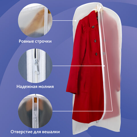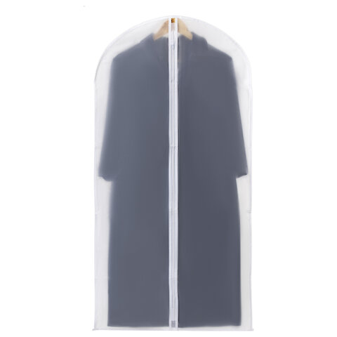 Чехлы для одежды выполнены из высокопрочного полупрозрачного гипоаллергенного материала – полиэтиленвинилацетата (PEVA). Такой материал надежно защищает одежду и дает возможность легко найти нужные вещи. Полупрозрачный белый цвет идеально подойдет для любого гардероба и сделает его более эстетичным.