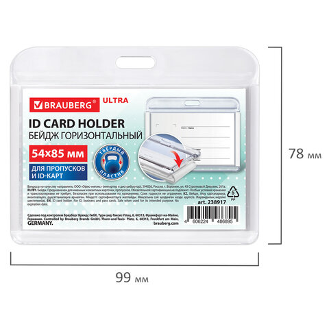 Бейдж горизонтальный для пропуска и ID-карт, 54х85 мм, белый, BRAUBERG ULTRA, 238917