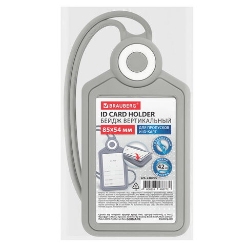 Купить Бейдж вертикальный для пропуска и ID-карт, СИЛИКОНОВЫЙ, 85х54 мм, шнурок 42 см, серый, BRAUBERG, 238905 вы можете в компании Канцтовары Карандашов, оформив заказ в интернет магазине, или