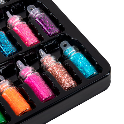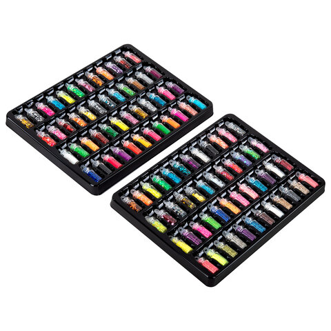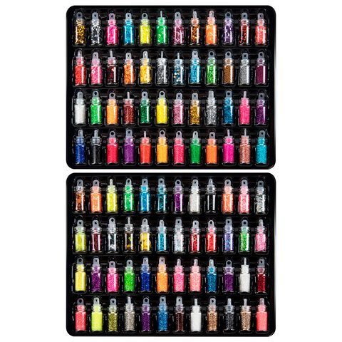 В упаковке 2 поддона с 96 туб с блестками, по 48 штук на каждом поддоне! Каждая баночка содержит уникальный наполнитель с блеском и ярким цветом, который идеально подходит для рукоделия.
