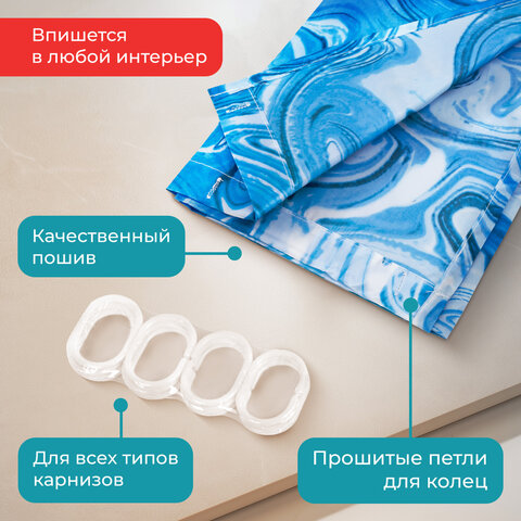 В комплекте с шторкой идут 12 прочных полипропиленовых колец, которые подойдут под любой тип карниза.