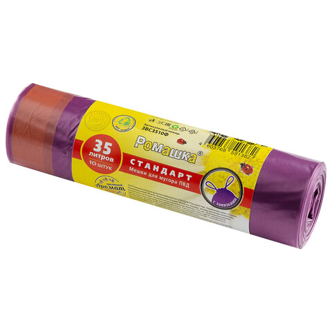 Купить Мешки для мусора с завязками 35 л., фиолетовые, в рулоне 10 шт., ПВД 25 мкм, 50х58 см, РОМАШКА, ЗВС3510Ф вы можете в компании Канцтовары Карандашов, оформив заказ в интернет магазине, или