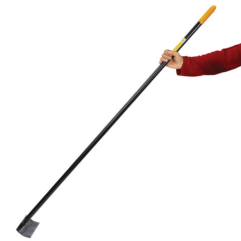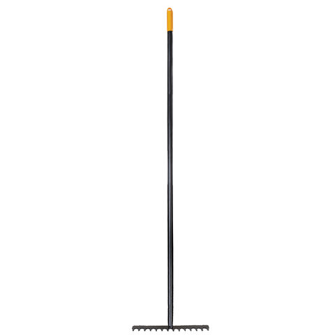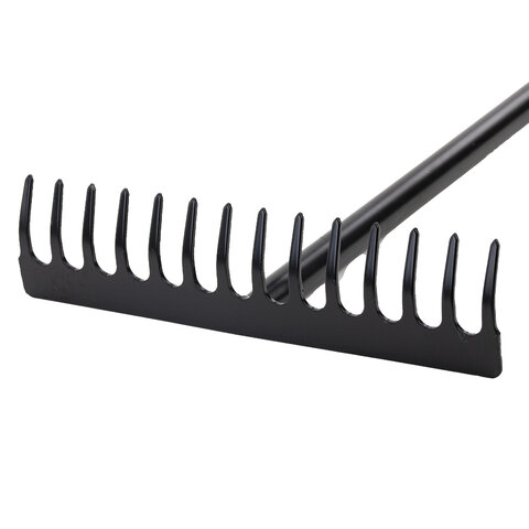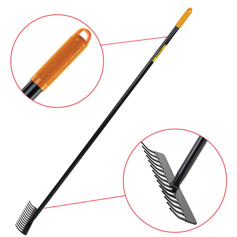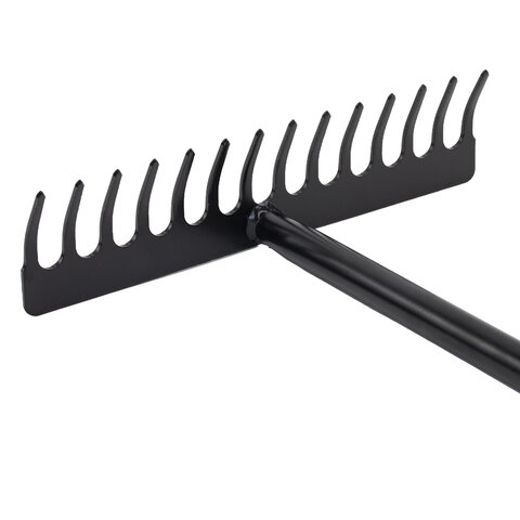 Максимальная надежность обеспечивается цельной конструкцией из стали, прошедшей специальную закалку. Инструмент способен выдержать любые нагрузки при длительной работе без потери прочности. Грабли оснащены 14 острыми стальными зубьями, расположенными на оптимальном расстоянии друг от друга, для наиболее эффективной работы с любыми материалами.