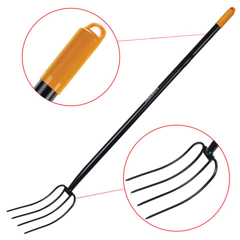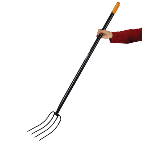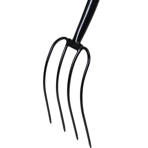 Максимальная надежность обеспечивается цельной конструкцией из стали, прошедшей специальную закалку. Инструмент способен выдержать любые нагрузки при длительной работе без потери прочности. Вилы оснащены 4 острыми стальными зубьями, расположенными под оптимальным углом для эффективной работы с любыми материалами.