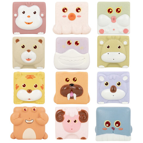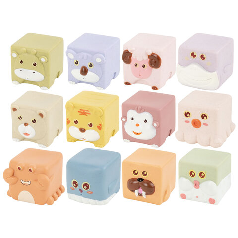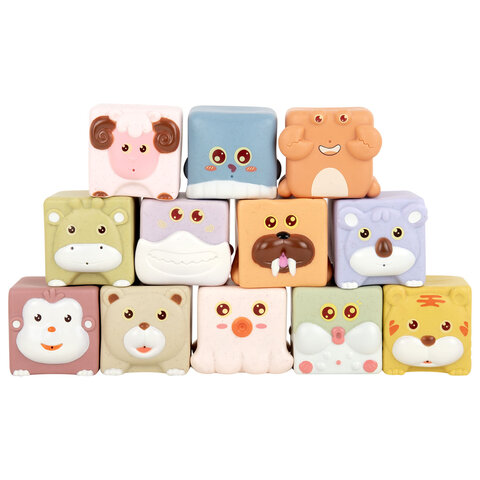 В наборе 12 тактильных кубиков с изображением животных: барашек, обезьянка, коала, жирафик, рыбка фугу, осьминожка, акулка, рыбка, крабик, медвежонок, тигрёнок, моржик. Изделия полые внутри.