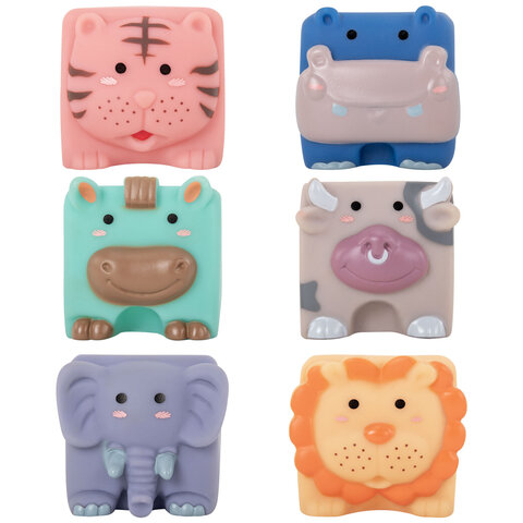 Развивающие тактильные кубики-животные выполнены из безопасного ПВХ, приятные на ощупь. Размер кубиков позволяет малышу удобно держать их в маленькой ручке. Каждый кубик размером 4,5х5х5,5 см.