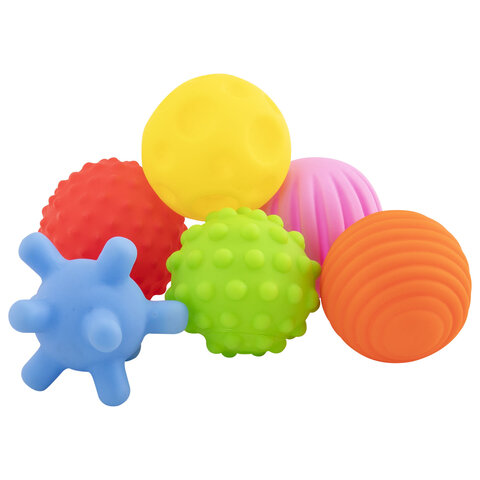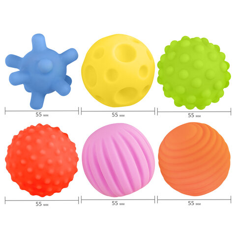 В наборе 6 тактильных мячиков различного рельефа и 6 разных цветов. Диаметр каждого мячика: 55 мм. Изделия полые внутри, при надавливании издают мягкий, свистящий звук за счет выхода воздуха.