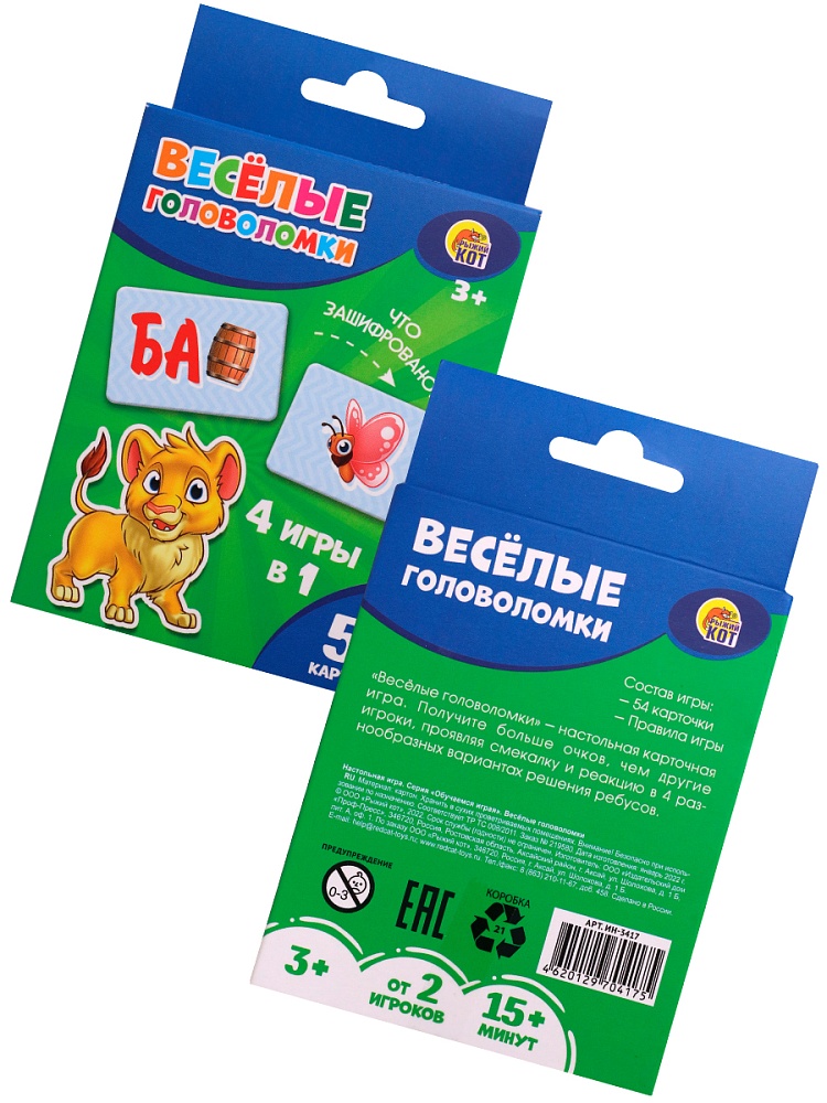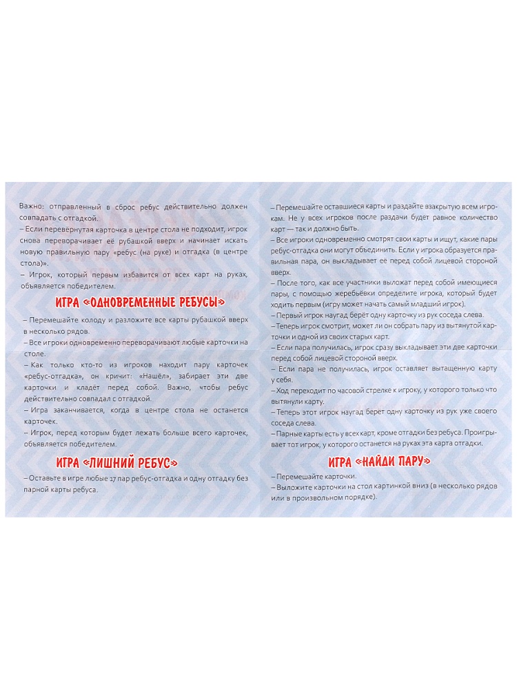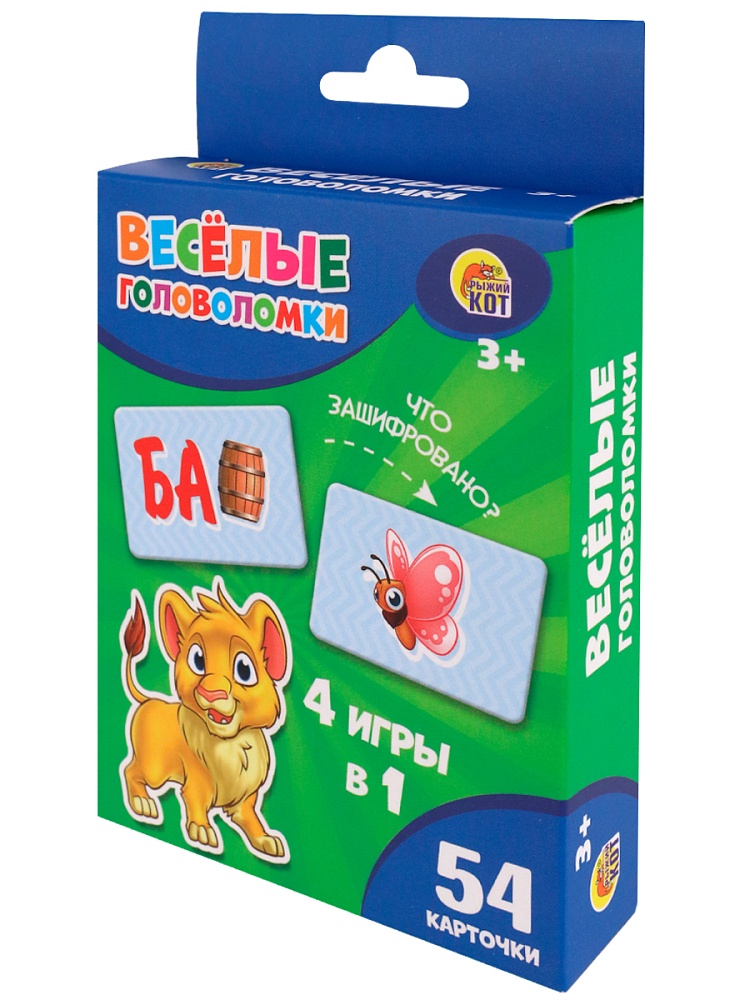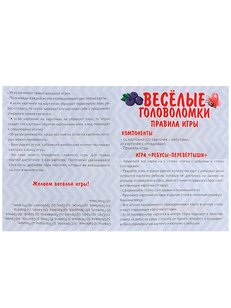 «Весёлые головоломки» - настольная карточная игра. Получите больше очков, чем другие игроки, проявляя смекалку и реакцию в 4 разнообразных вариантах решения ребусов.