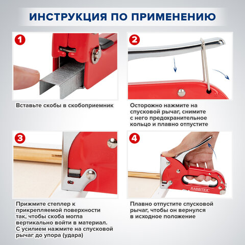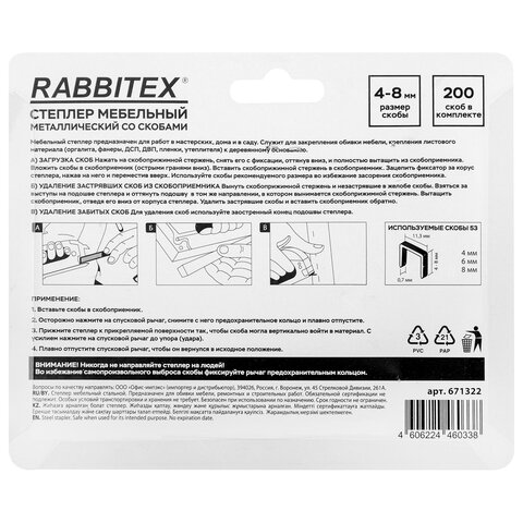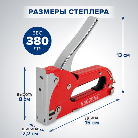 Купить Степлер мебельный стальной, тип скобы 53, высота скоб 4-8 мм, 200 скоб 8 мм в комплекте, RABBITEX (РАББИТЕКС), 671322 вы можете в компании Канцтовары Карандашов, оформив заказ в интернет магазине, или