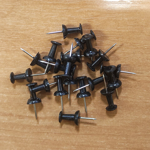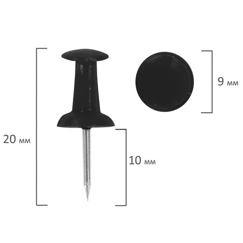 Имеют черную пластиковую шляпку диаметром 9 мм и стальное остриё длиной 10 мм. 50 штук в картонной коробке.