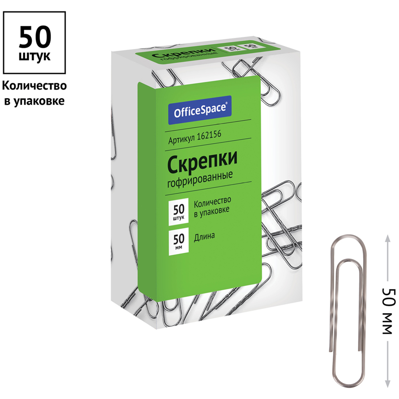 Скрепки 50мм, OfficeSpace, 50шт., никелированные, гофрированные, карт. упаковка