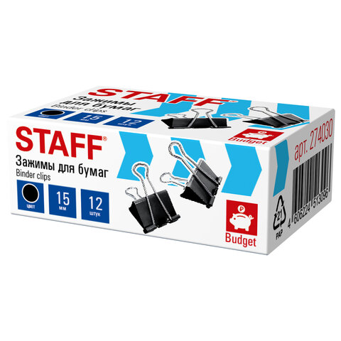 Купить Зажимы для бумаг STAFF ECO, КОМПЛЕКТ 12 шт., 15 мм, на 45 листов, черные, картонная коробка, 274030 вы можете в компании Канцтовары Карандашов, оформив заказ в интернет магазине, или