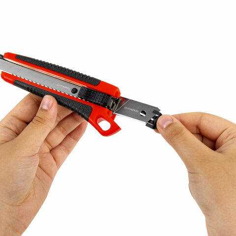 Легкий пластиковый корпус с металлическими направляющими надежно удерживает остро отточенное лезвие стандартной ширины 18 мм. По мере использования отработанные концы лезвия просто отламываются. В комплект входят 2 запасных лезвия, расположены в корпусе ножа. Дизайн корпуса эргономичный. Резиновые края ручки предотвращают скольжение пальцев, исключают их травмирование. Для удобства хранения имеется отверстие для подвеса. Яркий красный корпус выделяет инструмент среди других подобных, нож упакован в блистер с европодвесом.