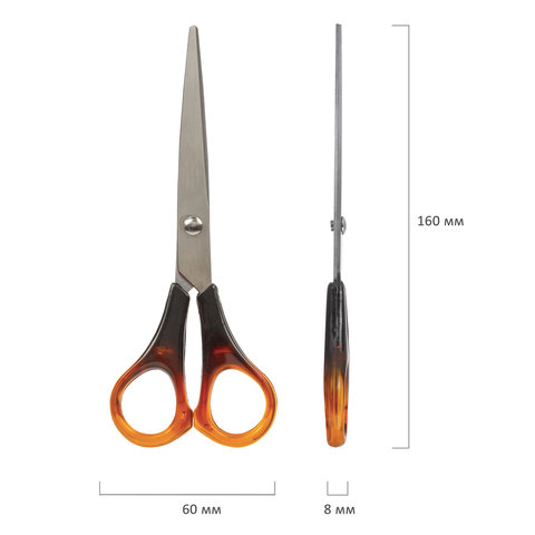 Длина ножниц - 160 мм, вес с упаковкой - 33 г. Лезвия изготовлены из прочной нержавеющей стали и обладают высокой износоустойчивостью. Материал не подвержен коррозийным процессам, благодаря чему срок службы ножниц практически не ограничен. Лезвия заточены с двух сторон, за счет чего режущие свойства остаются неизменными на протяжении длительного периода времени. Концы лезвий закругленные, что существенно повышает безопасность эксплуатации. Ручки ножниц STAFF симметричны, изготовлены из пластика, имитирующего окрас натурального янтаря.
