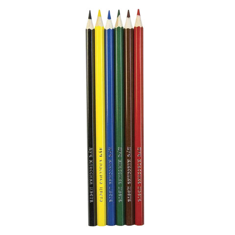 6 цветов. Шестигранные заточенные карандаши "Классика" длиной 178 мм имеют грифель повышенной прочности, диаметр которого 3 мм, прекрасно пишут и хорошо смешиваются. Рисунок ложится на бумагу густо, сплошной чёткой линией. Лакированный корпус придает изделию привлекательный вид. Легко затачиваются. Поставляются в картонной упаковке с европодвесом.