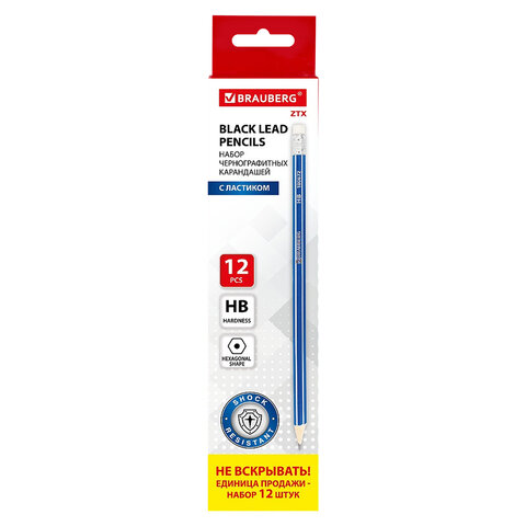 Купить Карандаши чернографитные BRAUBERG НАБОР 12 шт., "ZTX", HB, с резинкой, синий корпус, картонная упаковка, 180672 вы можете в компании Канцтовары Карандашов, оформив заказ в интернет магазине, или