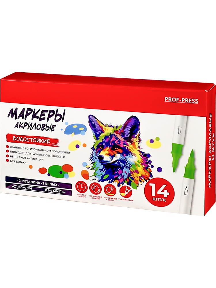 Акриловые маркеры легко адаптируются к различным материалам и обеспечивают высокое качество покрытия и насыщенные цвета, идеальны для любых поверхностей. Набор акриловых маркеров будет превосходным подарком, который наверняка порадует и вдохновит получателя. Этот набор акриловых маркеров подарит удовольствие и радость всем любителям искусства, профессиональным и начинающим художникам, детям и взрослым. Акриловые маркеры представлены в наборе из 14 штук. В комплекте 2 белых цвета и 2 цвета металлик