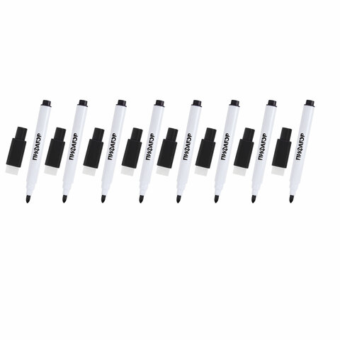 8 штук в наборе. Цвет чернил – черный. Круглый пластиковый корпус имеет диаметр 10 мм. Пулевидный наконечник обеспечивает толщину линии письма от 1 до 2 мм, что позволяет проводить тонкие линии и использовать маркер на небольших магнитных досках и планерах. Колпачок маркера оснащен магнитом, что делает его удобным в использовании и позволяет крепить маркер прямо на доске, планере или любом другом магнитном рабочем месте. Кроме того, в колпачке имеется удобная губка-стиратель для удаления записей. Чернила на спиртовой основе быстро высыхают и легко стираются сухой губкой, не оставляя разводов. Изделие не подлежит перезаправке. Цвет колпачка соответствует цвету чернил.