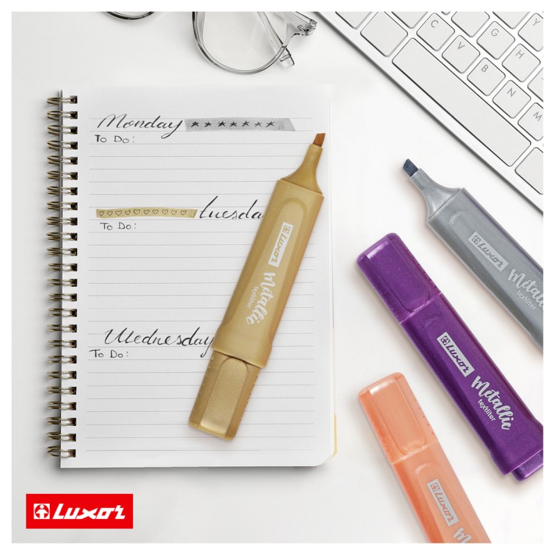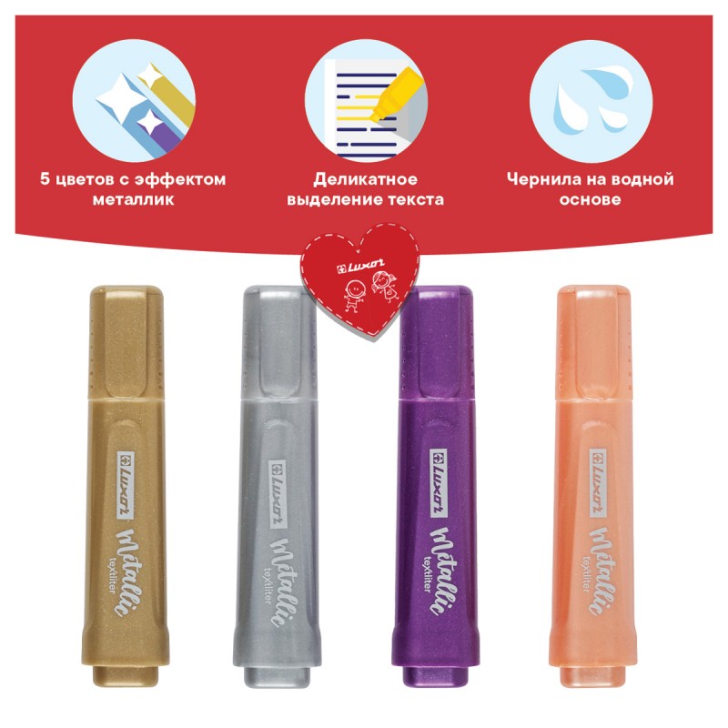 Набор текстовыделителей Luxor "Textliter Metallic - четыре маркера c эффектом металлик в одном наборе. Чернила с эффектом металлик создадут необычные переливы при письме.