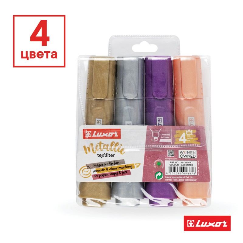 Купить Набор текстовыделителей Luxor "Textliter Metallic" 04 цвета, 1-5мм, чехол с европодвесом. вы можете в компании Канцтовары Карандашов, оформив заказ в интернет магазине, или