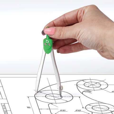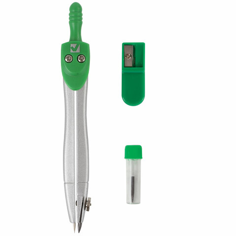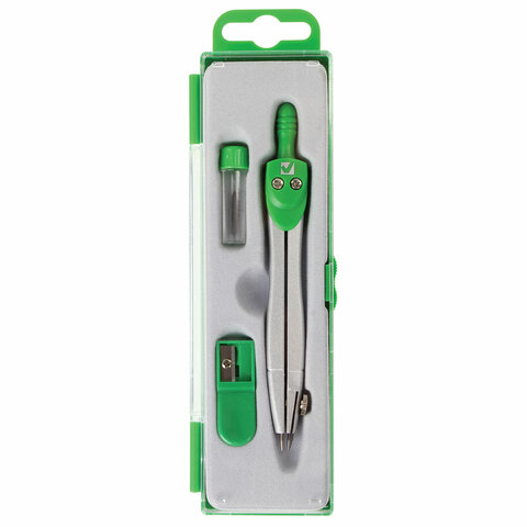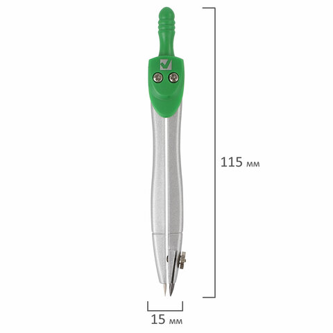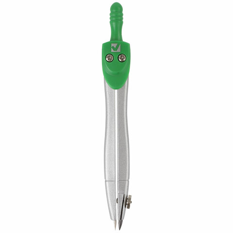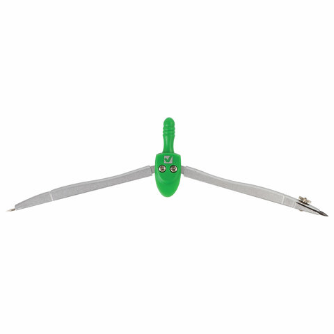 Циркуль длиной 115 мм имеет несгибаемые штанги. Изготовлен из металла, дополнительный цвет элементов – зеленый.