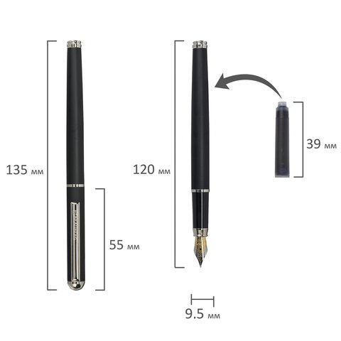 Стильная модель перьевой ручки с корпусом из металла черного цвета и хромированными деталями. Синий цвет чернил, иридиевое перо украшено гравировкой. Диаметр пишущего узла 0,5 мм создает ровню линию письма, равную 0,25 мм. Поставляется в фирменной упаковке.