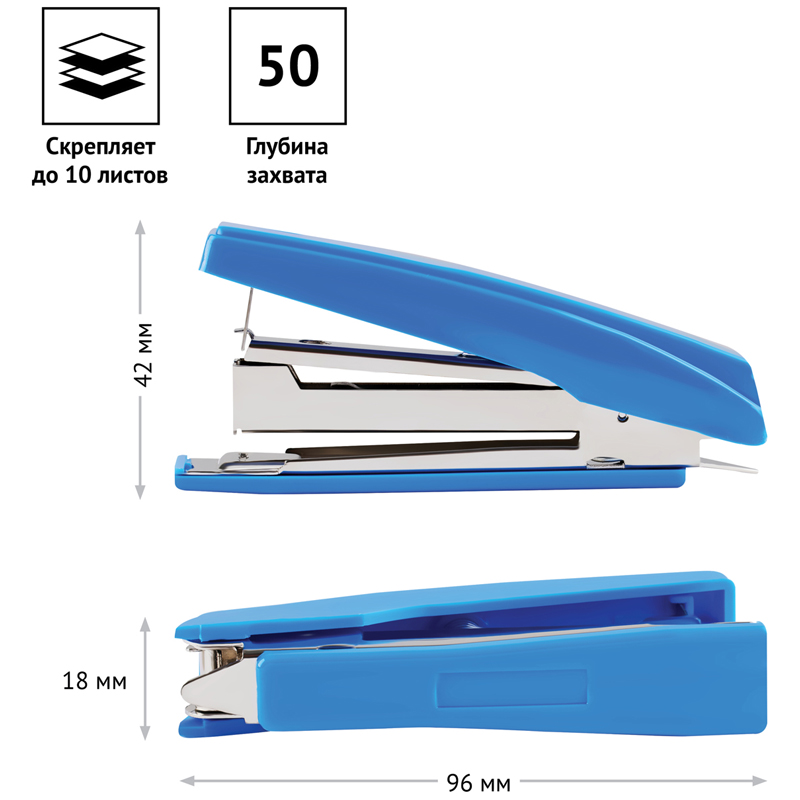 Сшивает до 10 листов. Материал корпуса - пластик, механизм - металл. Цвета ассорти.